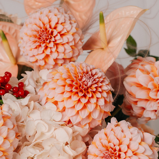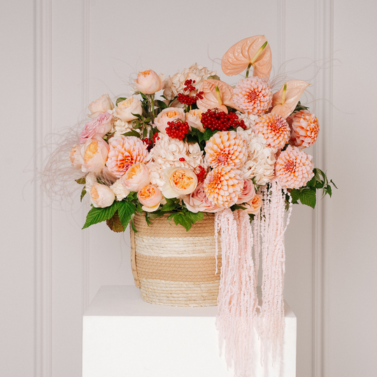 Букет в корзине пастельных тонов из георгин, гортензии, садовой розы, антуриума, вибурнума, амарантуса, стифы и малины.