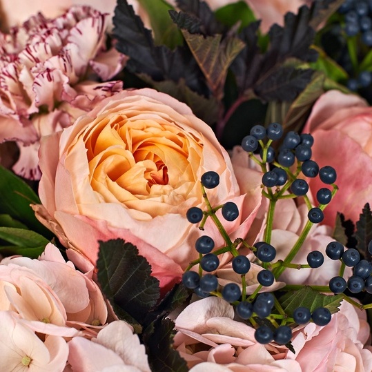 Букет из Пионов, вибурнума, гортензии, гвоздики, роз дэвид остин «Princess Aiko», физокарпуса.