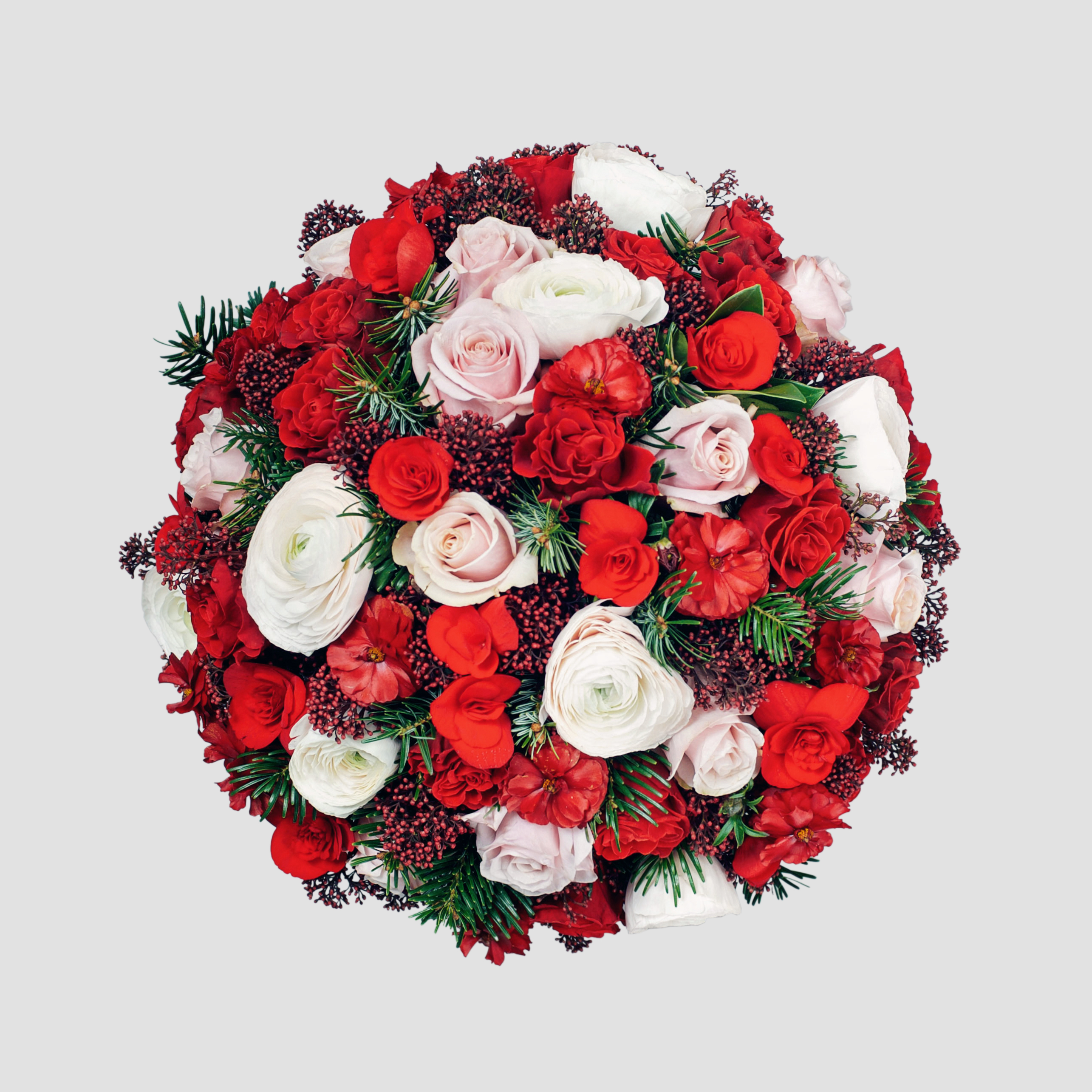 Букет из красных и белых цветов Розы одноголовой, ранункулюса, бегонии, скиммии, нобилиса.