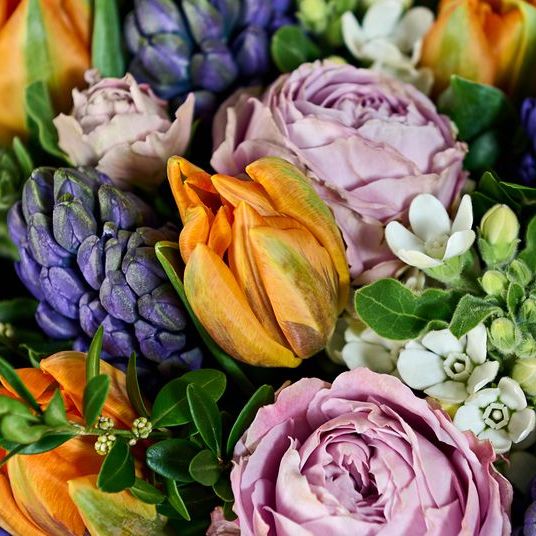 Букет из оранжевых тюльпанов, гиацинта, оксипеталума, розы кустовой, букуса.