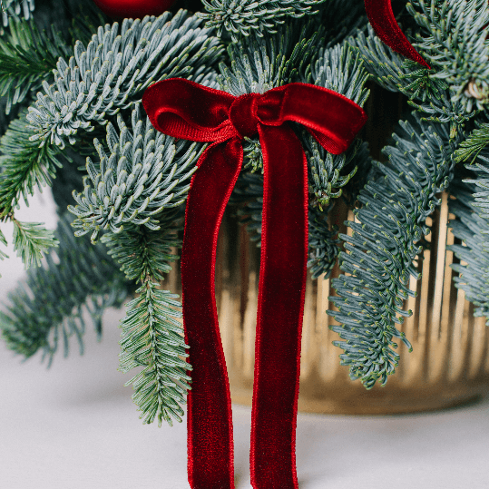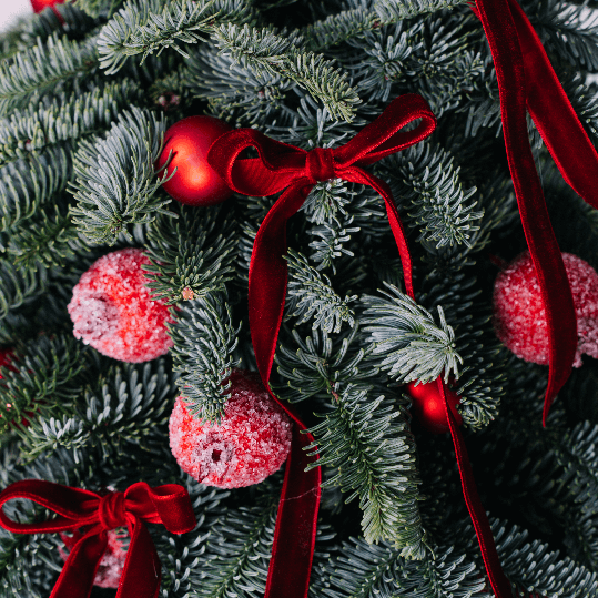 Новогодняя композиция из натуральной ели с красными шарами и лентами