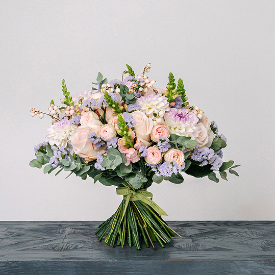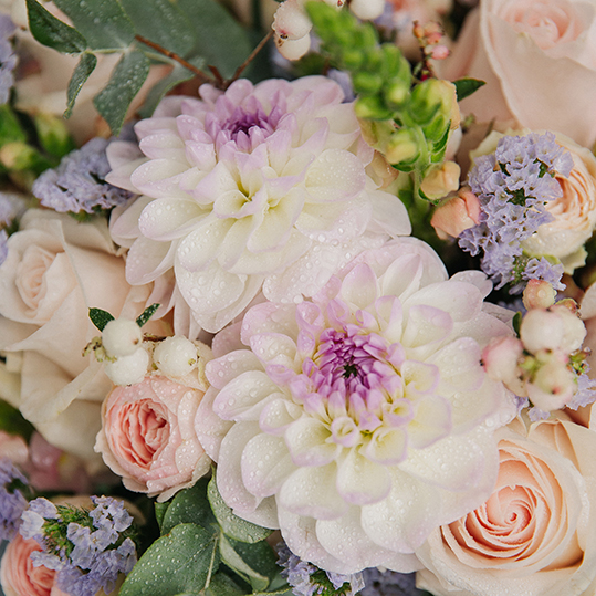 Букет из кремовых и сиреневых цветов Георгин, антириума, симфорикарпуса, роз, статицы, эвкалипта.