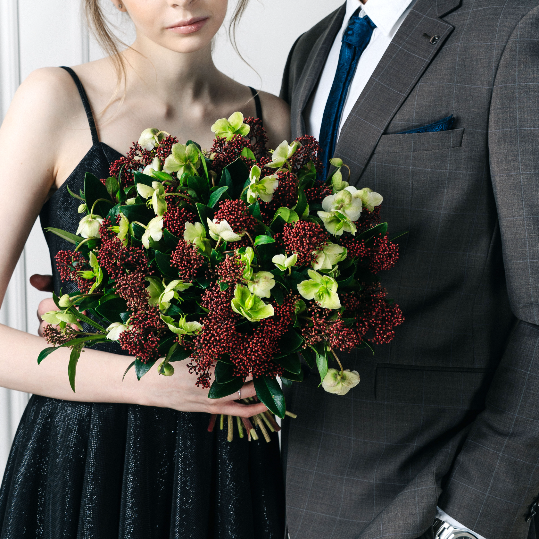 Очаровательный букет из зеленого Хелеборуса и скиммии.