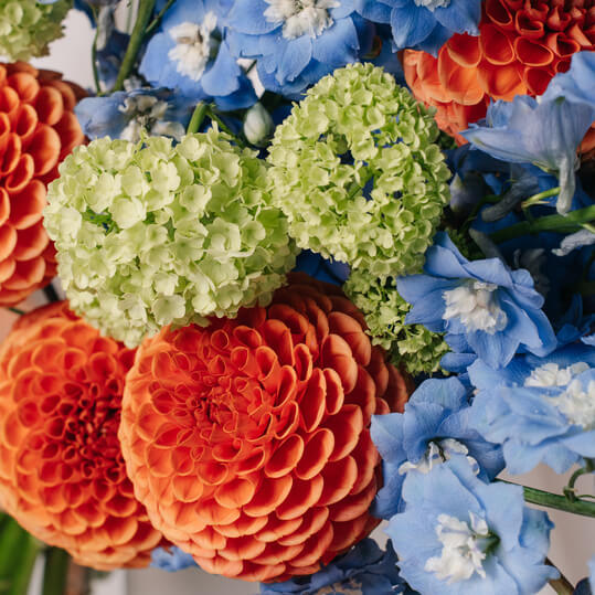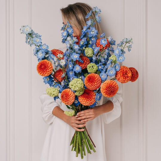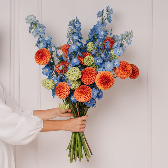 Букет из голубых и оранжевых цветов дельфиниума, георгин, вибурнума.