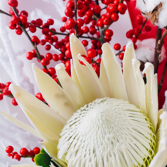 Букет из белой Протеи, хлопка, илекса и мирики.