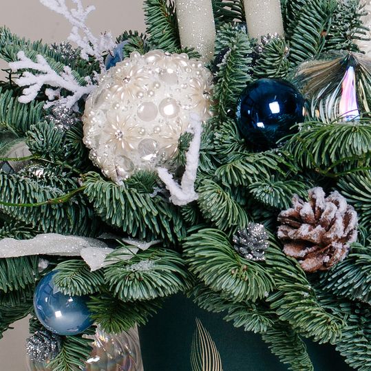 Новогодняя композиция с шарами из Нобелиса, свечей, шаров.