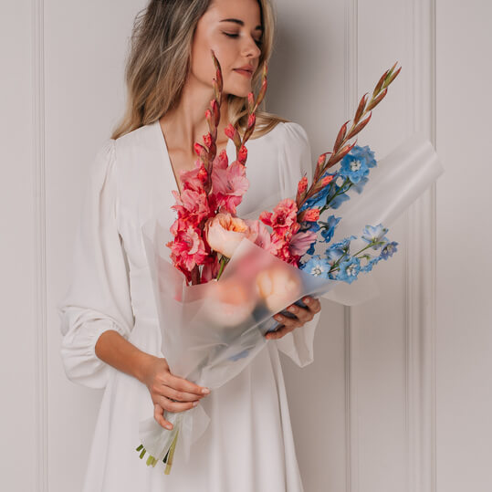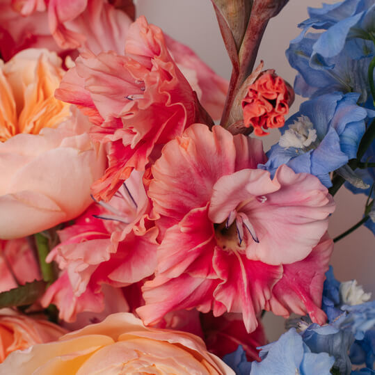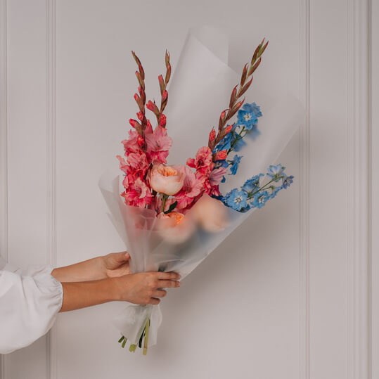 Букет из голубого дельфиниума, розовых гладиолусов и розы садовой.