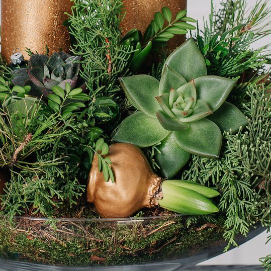 Новогодняя композиция из свечей, шаров, луковиц, оазиса.