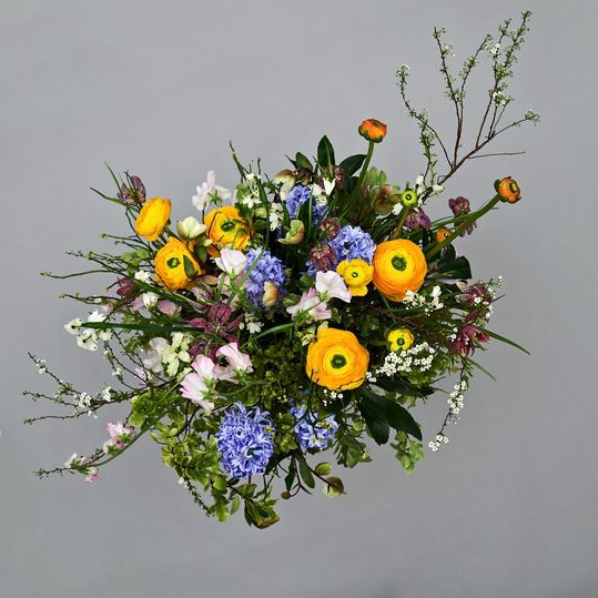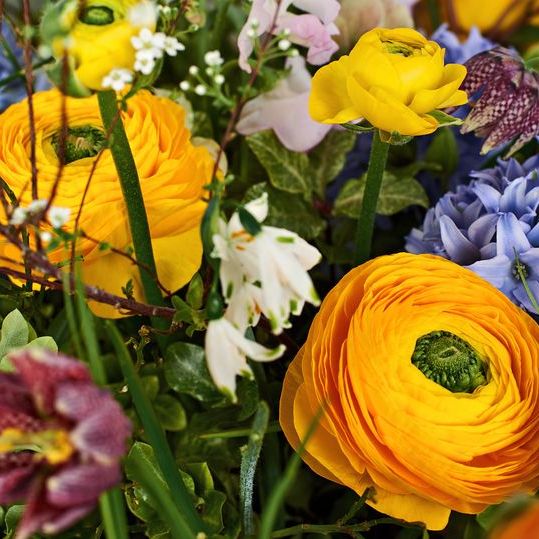 Букет в коробке из Ранункулюса, гиацинта, хелеборуса, латируса, фритилярии, спиреи, питоспорума.